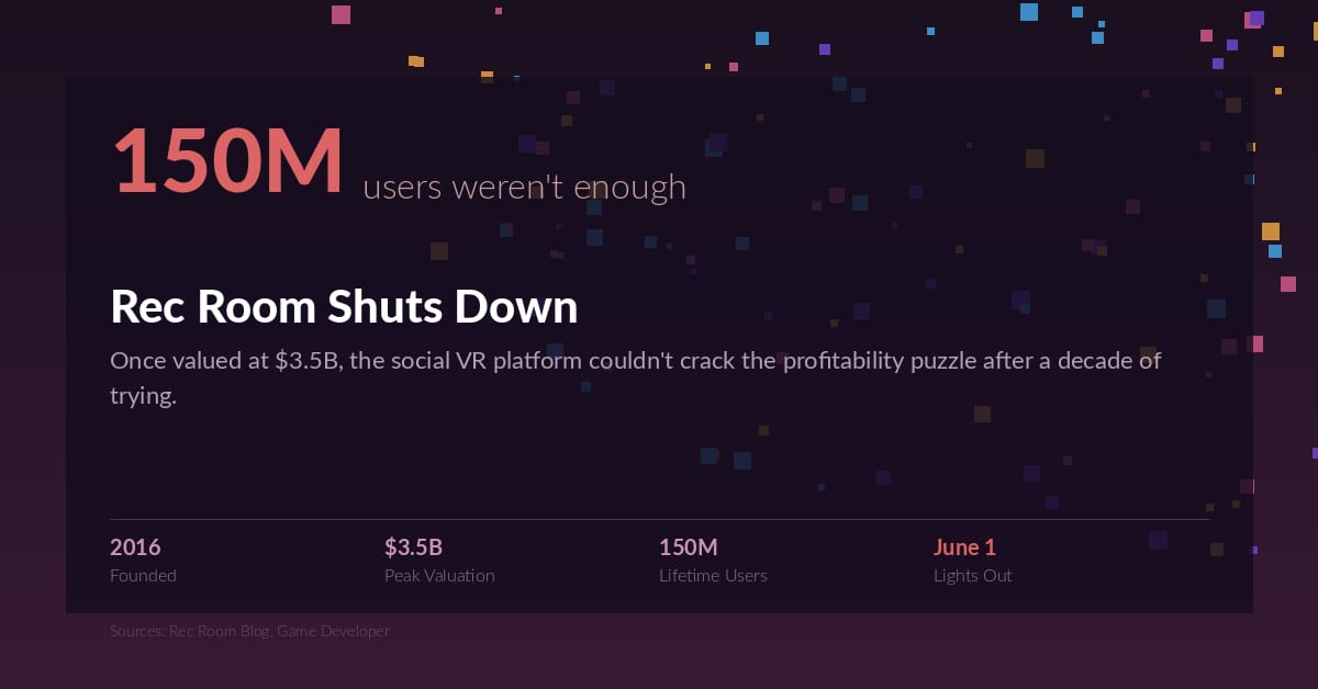 Lessons for Founders: Rec Room is a sobering reminder that user growth is not the same as a business model. 150 million users sounds incredible — until you realize that without a path to profitable unit economics, every additional user can actually make your problem worse. If your costs scale faster than your revenue, no amount of fundraising will save you. The team's decision to "close on their own terms rather than run the clock to zero" is a rare show of grace in startup-land, but the lesson is clear: figure out your path to profitability before you run out of runway, not after.